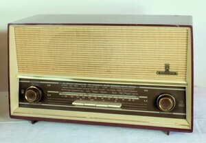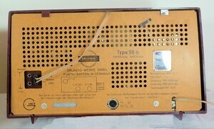 1965/1966 gab es dies kleine Tischgerät von Grundig mit lediglich 2 Wellenbereichen. UKW und MW. Beide werden über Drucktasten bedient ebenso "Aus" und "TA" . Die Einstellungen Laut/ Leise, die Höhen/Tiefen und die Senderwahl erfolgen per Drehknopf. Eingebaut ist ein kleiner Lautsprecher von 2,5 Watt. Auf derRückseite sind Eingänge für Phono, Tonband, ext. Lautsprecher und Antennen