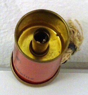 Dieses Werbegeschenk der Firma Strumpf aus Mainz ist ein Messingbehälter mit Reisenähzeug. Es beinhaltet Nähgarn, eine Stecknadel und mehrere Nähnadeln. Der Verschluss dient auch als Fingerhut.