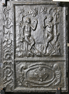 Stark verwitterte Ofenplatte links mit dem Motiv Adam und Eva im Paradis, darunter eine Kartusche. Hergestellt in der Hütte in Quint, heute ein Stadtteil von Trier. Die Darstellung bezieht sich auf die Schöpfungsgeschichte aus der Bibel 1 Mose 3 Quint (?) um 1700 VD Nr 488 Hergestellt wurde die Ofenplatte von der Eisenhütte in Quint (heute ein Stadtteil von Trier). Diese wurde 1683 gegründet und entwickelte sich im Laufe der Zeit zu einem bedeutenden Unternehmen. Sie betrieb von 1857 bis 1891 bei Schweich ein eigenes Eisenbergwerk. Nach mehrfachem Besitzerwechsel kommt das Unternehmen zum Klöckner-Konzern, der 1925 das Walzwerk stilllegt und zum 31.1.1972 diesen Unternehmensteil ganz aufgibt. Quinter Ofen- und Takenplatten wurden von Ende des 17. Jahrhunderts bis 1840 und nach dem Zweiten Weltkrieg bis zur Werksstilllegung 1972 hergestellt.Heute (2021) sind nur noch das Schloss des Hüttenherrn und einige Verwaltungsgebäude erhalten.