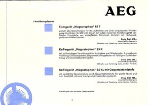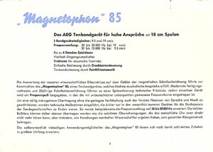 Von 1951 eine gedruckte, 8 seitige Broschüre (Original) für AEG Magnetophon 85 T, 85 K, 85 KL in deutsch. Technische Daten, Vorzüge und die Differenzierung der 3 Typen sind ausführlich beschrieben.