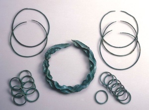 Die Schmuckringe aus Bronze wurden in einem Frauengrab gefunden. Ihre optische Wirkung beruht auf einer einfachen Technik: Vierkantige oder an den Kanten zu Blechstreifen ausgeschmiedete Stäbe wurden wechselnd verdreht - "gewendelt". Eine Manschette muss den Hals der Frau, die das scharfkantige Stück trug, geschützt haben. Die dünneren Drahtwendelringe wurden paarig oder zu mehreren getragen. Sie waren Kopfschmuck von Frauen aus dem Mittelrheingebiet. Verschiedene Formen dieser Wendelringe waren in älteren Eisenzeit als Frauenschmuck von Skandinavien bis zum Rheinland in Mode. Der überdurchschnittliche Umfang der Trachtbeigaben aus dem Frauengrab von Hunolstein, um 540 v. Chr., weist ihre einstige Besitzerin als wohlhabend aus.