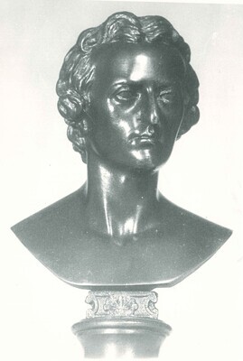 Schwarzweißfotografie. Büste in Eisenguss des deutschen Schriftstellers Johann Wolfgang von Goethes. Es handelt sich hierbei um einen Nachguss der Concordiahütte. Die Büste gehört zum Bestand des Rheinischen Eisenkunstguss-Museums (Vgl. 4.320).