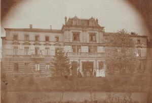 Schwarzweißfotografie. Die Aufnahme zeigt die sog. Villa Erlenmeyer, also das Wohnhaus von Dr. Friedrich Albrecht Erlenmeyer in Bendorf im Jahr 1917. Sie stand im Bereich des heutigen Hanswiesenweges in Bendorf. Dr. Friedrich Albrecht Erlenmeyer war in die Fußstapfen seines Vaters des Psychiaters Adolph Albrecht Erlenmeyer (1822-1877) getreten. Friedrich Albrecht Erlenmeyer hatte im Februar 1873 seine Studien der Medizin in Bonn, Halle, Würzburg, Greifswald, Wien und Berlin mit der Promotion abgeschlossen und übernahm von seinem Vater in Bendorf die Leitung der Dr. Erlenmeyer´schen Anstalten, wozu das 1848 gegründete „Asyl für Gemüts- und Nervenkranke“ (heutige Rathäuser 1-2), die „Wasserheilanstalt Rheinau, Kurhaus für Nervöse und Erholungsbedürftige“ (Bürogebäude der Firma „Schall Baumanagement GmbH“) und die landwirtschaftliche „Kolonie Albrechtshof“ gehörten. Nach dem Tod des Vaters 1877 wurden die Einrichtungen von der Witwe, Frau Sanitätsrat Emma Erlenmeyer und den Söhnen Max und Friedrich Albrecht weitergeführt. Friedrich Albrecht Erlenmeyer hatte als Facharzt der Psychiatrie einen überregionalen Ruf. Er war Herausgeber und Mitbegründer der internationalen Monatsschrift „Centralblatt für Nervenheilkunde, Psychiatrien und gerichtliche Psychopathologien“ und verfasste selbst unzählige wissenschaftliche Beiträge. Seine Patienten kamen vorwiegend aus Preußen und den übrigen deutschen Staaten, aber auch aus Österreich, dem Königreich Niederlande, aus Belgien, Dänemark, Norwegen, der Schweiz, England, Russland, Frankreich, Amerika und Peru. Während des Ersten Weltkriegs fielen seine Söhne und Nachfolger Heinrich Albrecht und Albrecht Ernst. Erlenmeyer übertrug den gesamten Komplex der Heil- und Pflegeanstalt zu günstigen Konditionen an die Stadt Bendorf. Den Albrechtshof hatte Erlenmeyer bereits vor dem Ersten Weltkrieg verkauft. Am 16. Mai 1922 erhielt Erlenmeyer u.a. als langjähriges Stadtratsmitglied das Ehrenbürgerrecht der Stadt Bendorf. Auch in seinen letzten Lebensjahren führte Erlenmeyer eine kleine Arztpraxis und befasste sich in seiner Freizeit verstärkt mit der Geschichte der Stadt. Dabei setzte er sich u.a. für das Einrichten eines Archivs ein. Er starb am 7. Juni 1926. Sein Grabstein ist heute noch in der Nähe der Friedhofskapelle auf dem Bendorfer Friedhof erhalten. Im heutigen Rathaus hängt im Flur des 1. Obergeschosses ein Porträt des Dr. Friedrich Albrecht Erlenmeyer (Ölgemälde, von Heyden 1898).