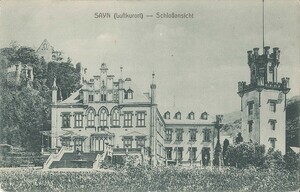 Schwarzweißfotografie. Diese Aufnahme aus dem Jahr 1931 zeigt einen Blick auf das Schloss Sayn mit Turm und Kapelle. Sie wurde vermutlich von der Kaiser Wilhelm-Höhe, auf der gegenüberliegenden Seite der Burg Sayn im Brexbachtal aufgenommen. Im Hintergrund sind die Ruinen der Burgmannenhäuser der Familien von Stein und Reiffenberg, im Vordergrund sind die Gassen und Wohnhäuser von Alt-Sayn zu erkennen. Am Fuße des Sayner Burgberges erbauten die Herren von Reiffenberg, Ministerialen der Sayner Grafen, im 14. Jahrhundert ein mittelalterliches Burghaus. Im Jahr 1753 fiel es durch Heirat an die Freiherren Boos von Waldeck, die es zu einem barocken Herrenhaus umbauten. Anfang des 19. Jahrhunderts wurde der Besitz durch Erwerb der unmittelbar benachbarten Güter und Weinberge des Reichsfreiherren vom und zum Stein vergrößert. Als Fürst Ludwig zu Sayn-Wittgenstein-Sayn mit seiner Ehefrau, Fürstin Leonilla, 1848 aus Russland wieder in die alte Heimat der Familie zurückkehrte, kaufte er das Anwesen mit den gesamten zugehörigen Liegenschaften von dem damaligen Koblenzer Landrat Graf Clemens Boos von Waldeck. Das barocke Herrenhaus, dessen Kern das spätmittelalterliche Burghaus bildete, ließ das Fürstenpaar zum Schloss umbauen. Mit dem Umbau wurde der Architekt Girard (1806-1872), der spätere Generalintendant des Louvre, betraut. Girard wählte, dem Zeitgeist und den Wünschen seiner Auftraggeber entsprechend, den neugotischen Stil. Es gelang ihm, ein einheitliches und harmonisches Werk zu schaffen, das die hohen Erwartungen der Zeitgenossen übertraf.In den 1860er Jahren wurde nach Plänen von Hermann Nebel (Stadtarchitekt von Koblenz) die neugotische Schlosskapelle errichtet. Eine Besonderheit ist die Verwendung von Architekturelementen aus Eisen, die in der benachbarten Sayner Hütte gegossen wurden. Das Schloss wurde 1945, kurz vor Kriegsende, erheblich beschädigt und verfiel. Mit wieder erwachender Wertschätzung der Neugotik erklärte man Schloss Sayn zu einem Baudenkmal von nationaler Bedeutung. Von 1995 bis 2000 wurde ein vom Land Rheinland-Pfalz gefördertes Revitialisierungs- und Restaurationsprogramm durchgeführt und das Schloss der Öffentlichkeit zugänglich gemacht.
