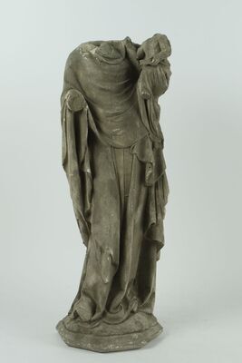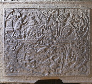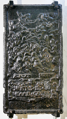 Fragment einer linken Ofenplatte mit dem Motiv der Auferstehung Christi. Sie geht auf den Manderscheider Bibelzyklus zurück. Ecken rechts oben und rechts unten fehlen. Platte etwas verwittert und links angestückelt. Rechts oben befinden sich die "Drei Marien". Der kniende Alte, den Christus emporzieht ist Abraham, der durch den Tod Christi aus dem Fegefeuer erlöst wird. Der Auferstandene trägt den geschwungenen viereckigen Nimbus. Das Sockelfeld ist nichgt mehr vorhanden. VD Nr 826