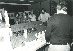Schwarzweißfotografie. Diese Aufnahme entstand am 09. Oktober 1981 während des Aufbaus der "Carl Ludwig Althans Ausstellung" im großen Sitzungssaal des Bendorfer Rathauses. In der Bildmitte ist das Modell im Maßstab 1:30 der im Jahr 1830 von Carl Ludwig Althans erbauten Gießhalle der Sayner Hütte in Bendorf-Sayn zu erkennen. Hinter dem Modell stehen links Fürstin Gabriela zu Sayn-Wittgestein-Sayn und ihr zugewandt im Gespräch der erste Beigeordnete der Stadt Bendorf, Gerd Saxer.
