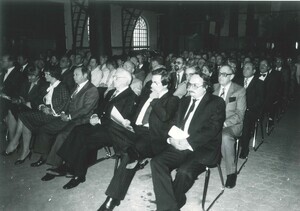 Schwarzweißfotografie. Diese Aufnahme entstand am 10. Oktober 1981 und zeigt die Gäste der Feierlichkeiten anlässlich der Eröffnung der "Carl Ludwig Althans Ausstellung". Die Gießhalle der Sayner Hütte in Bendorf-Sayn war 1830 von Althans erbaut worden. In der ersten Reihe ist als vierter von rechts der damalige Bürgermeister der Stadt Bendorf Dieter Trennheuser (im Amt von 1979 bis 1994) zu erkennen.