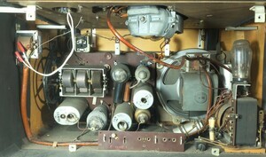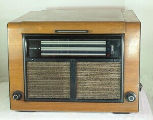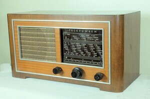 Ein Vorkriegsmodell (1939) von Telefunken mit eingebautem Plattenspieler. Das wuchtige Gehäuse hat fast die Form eines Würfels mit mehr als 40cm Kantenlänge. Die Frontseite ist im oberen Drittel zu Gunsten der Senderskala, horizontal geteilt. Unterhalb der Skala, hinter einem Stoffbezug, ist der Lautsprecher untergebracht. Ebenfalls an der Frontseite, im unteren Bereich, sind rechts und links schwarze Drehknöpfe, mit denen das Gerät bedient wird. Zum Ein/Ausschalten wird der linke, innere Knopf herausgezogen. Der seitliche angebrache Drehknopf dient der Wahl der Wellenbereiche bzw des Plattenspielers. Unter dem Deckel des Radios befindet sich ein Telefunken Plattenspieler. Es können nur Platten mit einer Geschwindigkeit von 78 Upm abgespielt werden. Auf der Rückseite ist der Röhrenplan aufgedruckt.