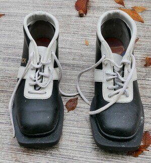 Ein paar Langlaufschue schwarz mit weissem Streifen für Langlaufskit mit Mausefallenbindung . Markenbezeichung Patrick Made in France. Ohne Größenbezeichung. Ca Ende der 1960er oder Anfang der 1970er Jahre.