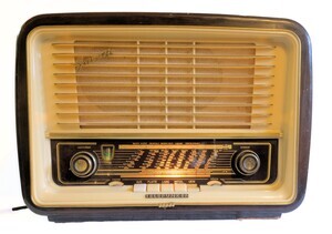 Ein kleineres Tischgerät aus den Jahren 1955/1956 von Telefunken. An der Vorderseite dominiert elfenbeinfarbenes Bakelit. Die dunkel eingefärbte Glasplatte im unteren Drittel zeigt in goldener Schrift die Sendestationen an. Rechts und links davon sind zwei Drehregler angeordnet mit deren Hilfe die Lautstärke eingestellt und die Sender ausgewählt werden können. Mittels Drucktasten können die Wellenbereich UKW/MW/LW eingeschaltet werden. Die Klangfarben werden mit zwei kleinen, senkrecht angeordneten Drehreglern verändert. Dieses relativ kleine Gerät verfügt über 3 Lautsprecher, wovon 2 seitlich abstrahlen. Rückseitig können Plattenspieler, Tonbandgerät und Zweitlautsprecher angeschlossen werden. Der Ladenpreis lag 1955 bei 280 DM