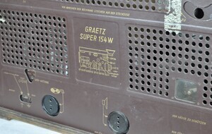 Ein Gerät mit vielen Rundungen aus dem Jahr 1950. Die Frontseite wird in der Höhe zu 2/3 durch einen Stoffbezug bedeckt, hinter dem sich der Lautsprecher verbirgt. Zur Auflockerung der Stofffläche sind mittig zwei horizontal verlaufende, furnierte Holzstreifen angebracht, deren Kanten durch goldfarbene Einfassung hervorgehoben werden. Im unteren Drittel, durch halbrunde Holzleisten abgegrenzt, dominiert die Senderskala. Rechts und links davon jeweils ein Drehknopf für Ein/Aus, Laut/Leise und Senderwahl. Ein Magisches Auge und ein Sichtfenster für den eingestellten Wellenbereich runden die Ansicht ab. An der linken Seitenwand ist ein weiterer Drehknopf eingebaut mit dem die Klangfarbe reguliert werden kann. An der rechten Seitenwand befindet sich ein Drehschalter mit tiefen Griffmulden mit dem die Wellenbereiche bzw der Plattenspieler ausgewählt werden können. Im Geschäft kostete das Gerät 1950 ca. 400 DM. Der durchschnittliche Monatsverdienst im produzierenden Gewerbe lag bei ca. 150 DM/Monat.