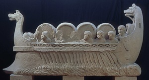 Das sogenannte Neumagener Weinschiff diente als Aufsatz des Grabdenkmals eines wohlhabenden Weinhändlers des 3. Jahrhunderts n. Chr. Obwohl das Schiff für den Transport von Fässern bestimmt ist, erinnert es in einigen Aspekten an ein Kriegsschiff - der Bug ist als Rammsporn gestaltet, die Steven sind mit Drachenköpfen versehen. An Deck sind noch acht Besatzungsmitglieder auszumachen. Vier große Fässer hat das Schiff geladen, vermutlich für den Transport von Moselwein und auch ein Zeichen für die bereits in römischer Zeit bedeutsame Weinbaukultur des Mosellandes.