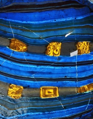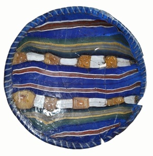 Das fast vollständig erhaltene Schälchen fällt durch seine leuchtende Farbigkeit auf. Der Glasmacher hat auf einer blauen Grundmasse rote, weiße, grüne und gelbe Glasstäbe parallel aneinandergelegt und zu einem Streifenmosaikschälchen zusammengeschmolzen. Die Schale wurde im frühen 1. Jahrhundert n. Chr. einem Verstorbenen als Beigabe mit ins Grab gegeben, was auch den guten Erhaltungszustand erklärt. Zwei weitere annähernd vollständige Glasschalen gleicher Größe stammen ebenfalls aus Trierer Gräbern.