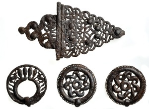 Das Eisenobjekt gehörte als Anhänger oder Zierscheibe zu einer eisernen Gürtelgarnitur, die in handwerklich anspruchsvoller Durchbruchsarbeit gestaltet ist. Je ein Wolf oder ein Hund kauert neben vier spindelförmigen Elementen. Am Ring ist eine Metallöse zur Aufhängung befestigt. Das Objekt hat mit dieser Darstellung enge Parallelen in der frühkeltischen Kunst. Es stammt von einem Hügelgräberfeld aus Hochscheid.