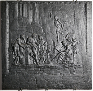 Takenplatte mit der Darstellung der Allegorie des Handels. Dargestellt ist in einer antikisierenden Szene die Entladung eines Schiffs mit Händlern, einem Buchhalter und einem Arbeiter. Im Hintergrund Tempelsäulen, eine Statue des Gottes Mercur und die Masten eines Segelschiffs. Lothringen (Südeifel?) Anfang 18. Jahrhundert VD Nr 1004