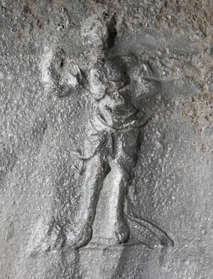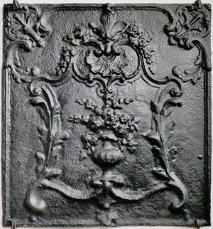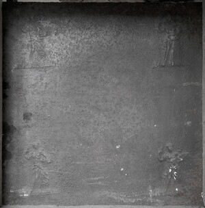 Kaminplatte mit 4 kleinen Figuren in den Ecken. Möglicherweise Allegorien der Vier Jahreszeiten. VD Nr 934 - zeigt eine deutlich kleinere Platte mit den im Prinzip selben Jahreszeiten-Modeln. Unsere Platte zeigt nur zwei der dort abgebildeten Figuren, diese dafür doppelt. So ist links oben und unten der Frühling und rechts oben und unten der Sommer abgebildet. Die Platte ist stark verwittert, was darauf hindeutet, dass sie warscheinlich als Kaminplatte genutzt wurde. Ob für die beiden Abdrücke der identischen Figur das gleiche Model oder ein sehr ähnliches genutzt wurde läßt sich auf Grund des schlechten Erhaltungszustands der Platte nicht definitiv sagen. Die Platte ist im Museum im Haus Stein in die rekonstruierte Takenheizung als Takenplatte eingebaut.