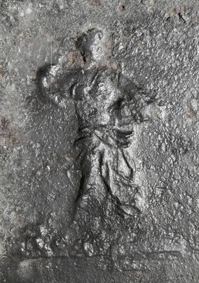 Kaminplatte mit 4 kleinen Figuren in den Ecken. Möglicherweise Allegorien der Vier Jahreszeiten. VD Nr 934 - zeigt eine deutlich kleinere Platte mit den im Prinzip selben Jahreszeiten-Modeln. Unsere Platte zeigt nur zwei der dort abgebildeten Figuren, diese dafür doppelt. So ist links oben und unten der Frühling und rechts oben und unten der Sommer abgebildet. Die Platte ist stark verwittert, was darauf hindeutet, dass sie warscheinlich als Kaminplatte genutzt wurde. Ob für die beiden Abdrücke der identischen Figur das gleiche Model oder ein sehr ähnliches genutzt wurde läßt sich auf Grund des schlechten Erhaltungszustands der Platte nicht definitiv sagen. Die Platte ist im Museum im Haus Stein in die rekonstruierte Takenheizung als Takenplatte eingebaut.