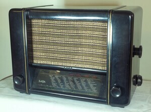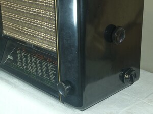 Hergestellt hat Saba diesen Radiotyp in den Jahren 1948/1949. Das Gehäuse besteht aus schwarzem Bakelit und ist an den Kanten abgerundet. Zwischen den beiden, 8cm breiten, seitlichen Rändern, spannt sich ein Stoffbezug, der den Lautsprecher verdeckt. Darunter die etwas schäg nach hinten geneigte Senderskala aus Glas. Dahinter die auf weißes Papier aufgdruckten Sendestationen. Empfangen werden LW/MW und KW. Noch nicht zur Verfügung stand UKW. Durch das Herausziehen des linken Drehschalters wir das Gerät eingeschaltet, sowie die Lautstärke geregelt. Auf der rechten Seitenwand befinden sich 2 weitere Drehschalter. Sie dienen der Sendereinstellung, der Wellenbereichswahl bzw Plattenspieler. Auf der Rückseite sind Eingangsbuchsen für Plattenspieler und externe Lautsprecher vorhanden. Saba Villingen 1948/1949 Radio, Röhrenradio, Rundfunkempänger, Hörfunk ,