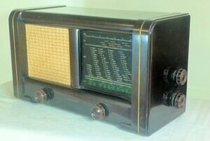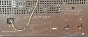 Der Empfänger Saba Meersburg W 4 wurde in den Jahren 1954 gebaut. Der etwas wuchtige Auftritt ist typisch für diese Jahre. Der Korpus besteht hauptsächlich aus dunkel lackiertem Holz. An der Frontseite verdeckt ein Stoffbezug den Lautsprecher. Darunter befindet sich die, leicht nach hinten geneigte, Senderskala aus Glas mit aufgedruckten goldfarbenen Sendestationen. Ebenfalls in die Glasplatte eingearbeitet sind zwei kleine Sichtfenster zur Kontrolle des gewählten Klangbildes, sowie ein zusätzliches, rundes Sichtfenster, in dem sich die Position der Peilantenne ablesen lässt. Rechts und links der 6 Drucktasten, für die Wahl der Wellenbereiche, Aus und Tonabnehmer, sind 2 große Drehregler mit denen die Lautstärke, die Peilantenne, und die Sender eingestellt werden können. Auf der Rückseite befinden sich Anschlüsse für Plattenspieler und Lautsprecher. Darüber hinaus ist die Röhrenbestückung aufgedruckt.