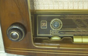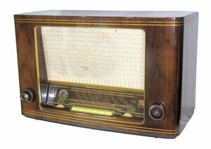 Der Empfänger Saba Meersburg W 4 wurde in den Jahren 1954 gebaut. Der etwas wuchtige Auftritt ist typisch für diese Jahre. Der Korpus besteht hauptsächlich aus dunkel lackiertem Holz. An der Frontseite verdeckt ein Stoffbezug den Lautsprecher. Darunter befindet sich die, leicht nach hinten geneigte, Senderskala aus Glas mit aufgedruckten goldfarbenen Sendestationen. Ebenfalls in die Glasplatte eingearbeitet sind zwei kleine Sichtfenster zur Kontrolle des gewählten Klangbildes, sowie ein zusätzliches, rundes Sichtfenster, in dem sich die Position der Peilantenne ablesen lässt. Rechts und links der 6 Drucktasten, für die Wahl der Wellenbereiche, Aus und Tonabnehmer, sind 2 große Drehregler mit denen die Lautstärke, die Peilantenne, und die Sender eingestellt werden können. Auf der Rückseite befinden sich Anschlüsse für Plattenspieler und Lautsprecher. Darüber hinaus ist die Röhrenbestückung aufgedruckt.