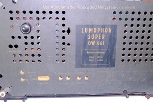 Die Firma Lumophon aus Nürnberg baute 1950 und 1951 den GW 461. Das Gehäuse besteht komplett aus Bakelit. Die Gehäusegestaltung entsprach der allgemeinen Linie. Links, hinter Stoff, der Lautsprecher, rechts die Senderskala. Unterhalb des Ausschnitts ist ein ca. 8 cm breiter Rand, in den jeweils ein Drehregler links und rechts integriert sind. Mit ihnen wird das Gerät ein und ausgeschaltet, die Lautstärke geregelt und die Sender eingestellt. An der rechten Seitenwand sind weitere 2 Drehregler zur Einstellung der Wellenbereiche, MW/KW/LW/ UKW und dem Plattenspieler eingebaut. Rückseitig gibt es einen weiteren Drehregler zum Einstellen der Peilantenne. Anschlüsse sind vorhanden für Plattenspieler, Zweitlautsprecher , Antenne und Erde. Zusätzlich ist der Röhrenplan noch aufgedruckt.