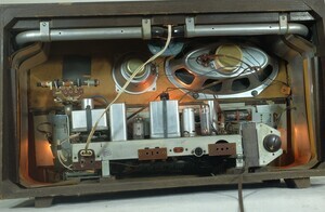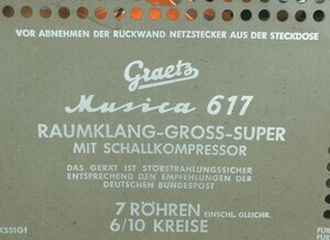 Graetz Musica 617 - Dieser „Raumklang Großsuper mit Schallkompressor“, ein Tischgerät zwischen 1958/1959 gebaut. Die vielen eingebauten Drucktasten und Drehschalter gehen etwas zu Lasten der Übersichtlichkeit. Es sind insgesamt 12 Drucktasten, mehrere Drehregler, ein magisches Auge und zwei Sichtfenster zur optischen Kontrolle der Höhen bzw. Tiefeneinstellung. Alles ist im Bereich der Senderskala angeordnet. Besonders beworben wurde der besondere Raumklang, der eingebaute Schallkompessor mit einem Druckkammersystem und Klangrohrstahlern . So soll eine besonders gute Klangwiedergabe erreicht werden. Eine Besonderheiten diesem Gerät ist die Einstellmöglichkeit der Ferritantenne. Sie erfolgt von der Rückseite aus über einen Hebelarm. Externe Anschlüsse gibt es für Plattenspieler, Tonband und Lautsprecher. 350 DM musste der Käufer 1958 für dieses Gerät bezahlen.