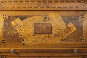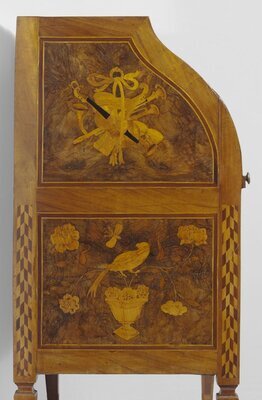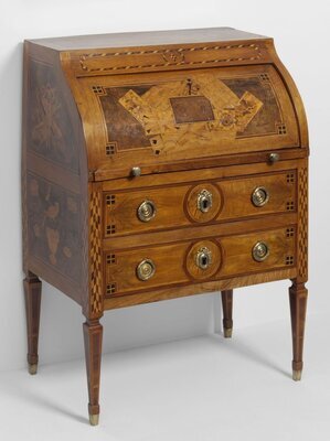 Bei dem zierlichen, für Damen konzipierten Schreibtisch handelt es sich um ein so genanntes Zylinder- oder Rollbureau. Die gerundete Abdeckung in Form eines Viertelzylinders kann zurückgeschoben werden, um die Schreibplatte freizugeben. Die Schreibplatte ist herausziehbar, darunter befinden sich zwei Schubladen. Die zierlichen Beine haben die Form umgedrehter Obelisken. Der Korpus des Möbels entspricht mit seiner klaren Gliederung, seinen geometrischen Formen und geraden Linien ganz dem Geschmack des Frühklassizismus und dem unter König Ludwig XVI. aufkommenden, nach ihm benannten Stil "Louis-seize", der sich durch seine zurückgenommene Formensprache deutlich von Barock und Rokoko absetzte. Das gesamte Möbelstück ist mit reichen Einlegearbeiten aus verschiedenen Hölzern versehen. Geometrische Ornamente zur Gliederung und Rahmung kontrastieren mit lockeren Stillleben: Auf den beiden Schmalseiten sind Blumenvasen mit Papageien und Trophäen mit Musikinstrumenten dargestellt. Der Rollzylinder zeigt ein Quodlibet (eine Art Trompe-l'œil) aus ungeordnet "herumliegender" Spielkarten, dem Aufmacher einer Ausgabe der "Carlsruher Zeitung" und einem Theaterprogramm aus dem Jahr 1789 zu dem Trauerspiel "Alcestes oder Die ungleiche Vaterliebe". Der Sekretär wurde von Nicolaus Camus, einem im elsässischen Wissembourg tätigen Kunstschreiner geschaffen. Der hohe künstlerische Anspruch des Sekretärs spiegelt sich auch im Selbstverständnis seines Herstellers wieder: Camus signierte sein Werk an prominenter Stelle, in dem er "Fait par Nicolaus Camus à Weißembourg" in eine der Karten auf dem Rollzylinder eingravierte. [Wolfgang Leitmeyer, Johanna Kätzel]