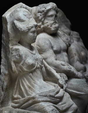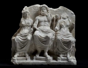 Die kleine Marmorgruppe zeigt die im höchsten Heiligtum des Römischen Reiches, dem Tempel des Jupiter auf dem Kapitol in Rom, verehrte Dreiheit der Götter Jupiter, Juno und Minerva - die Kapitolinische Trias. Sie sitzen auf einer gemeinsamen Thronbank mit rankenverzierter Rückenlehne und stützen ihre Füße auf kleine Schemel. Das Weihgeschenk zeigt jedoch nicht die Kultbilder der drei Götter im stadtrömischen Tempel des kapitolinischen Jupiter. Vielmehr geht die Darstellung auf die in Reliefs und Münzdarstellungen gut überlieferte Gruppe im Giebel des Tempels zurück, den Kaiser Domitian im späten 1. Jahrhundert n. Chr. nach einem Brand des Vorgängerbaus errichten ließ.