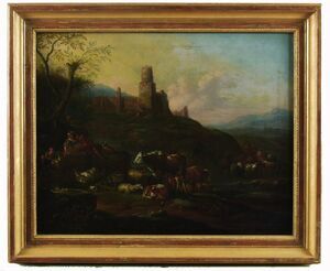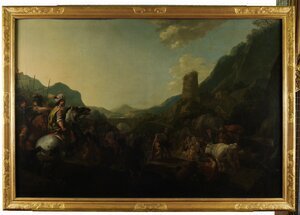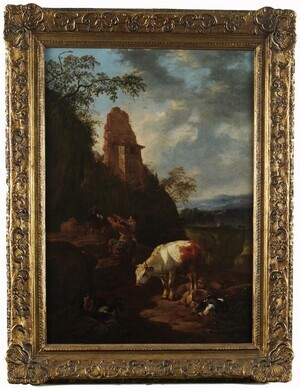 Darstellung nach 1. Moses 33. Jakob mit seinem Gefolge flieht vor seinem Bruder Esau, den er betrogen hat. Hügelige Landschaft mit zwei runden Türmen einer Burgruine. Die zweitürmige Ruine ist möglicherweise die Burg Kirkel im ehemals pfälzischen Kreis St. Ingbert, jetzt Kreis Homburg nach dem Brand von 1679. Sie thront über felsigen Steilhängen. Im Mittelgrund in einer Mulde nähert sich eine Tross von Menschen und Tiere auf der Flucht. Im Vordergrund rechts treibt ein Hirte eine Kuh aus einem Bach. Von links kommen Hunde, Schafe und Ziegen um Wasser zu trinken. Die Männer, Frauen und Kinder bereiten den Weiterzug vor, treiben ein Kamel, beladen ein Pferd und einen Esel. Weitere Tiere stehen in einem Gewässer. Leicht herbstlich färbt sich das Laub der Bäume im Vordergrund. Im Laufe der Kriegswirren des 30jährigen Krieges kam die Familie Roos zunächst nach Zweibrücken und später an den Niederrhein. 1647 begann Roos in Amsterdam eine Lehre beim Historienmaler Guilliam Dujardin. Dessen Sohn Carel bringt ihm den Stil von von Nicolaes Berchem nahe. Weitere Lehrer waren vermutlich Cornelis de Bie und der der Tier- und Bildnismaler Barend Graat. 1651/52 reiste Roos vermutlich nach Italien. Ab 1653 arbeitete er zusammen mit seinem Bruder Theodor Roos in Mainz. Neben Werken mit biblischen Themen schuf Roos in dieser Zeit auch Bildnisse. 1664 arbeitete er als Hofmaler in Heidelberg. Im Oktober 1667 zog Roos mit Frau und ihren gemeinsamen Kindern nach Frankfurt am Main und ließ sich dort als Maler nieder. Er starb als erfolgreicher Maler im Jahr 1685 beim Brand seines Hauses. Seine Kinder waren Philipp Peter (* 1657), der später unter dem Namen Rosa da Tivoli als Tiermaler Bekanntheit erlangte, Maria Ester (* 1662), Johann Melchior (* 1663), Johanna Ester (* 1666), Susanna Barbara (* 1668), Franz Peter (* 1672) und Peter (1675). Philipp Peter Roos und Johann Melchior Roos.