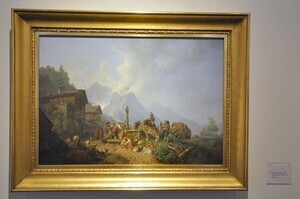 Weitere Inv. Nr. LG_0002_b. Im Hochgebirge, wahrscheinlich vor dem Hintergrund des Wettersteingebirges treffen sich verschieden Gruppen von Menschen. Bürkel hat dieses Genre vielfach variiert und über den Kunstverein vermarktet. Eineige Frauen sind dabei die Wäsche zu waschen, Eine Kutscher mit seinem Pferdegespann tritt ein, ein Esel wurde zur Tränke geführt, während sein Besitzer den Karren hält und sich mit Kutscher und Mägden unterhält. Links hinten im Bild entfernen sich zwei Mönche von dem Geschehen. Signiert und datiert links am unteren Bildrand: "H.Bürkel, 1845". Ab 1824 zählte Bürkel zu den ersten und wichtigsten Mitgliedern des neu gegründeten Münchener Kunstvereins, der ihm das Ausstellen seiner Bilder unabhängig von der Akademie ermöglichte. Durch den Münchner Kunstverein gelang es ihm, zahlreiche Werke zu verkaufen, zum Teil bis nach Nordamerika. Auf der Rückseite steht mit Bleistift: Kassel Stadtgalerie München Kunstverein. Zu Heinrich Bürkel siehe auch: https://de.wikipedia.org/wiki/Heinrich_B%C3%BCrkel