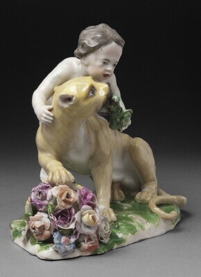 Panther mit Putto auf Rasensockel. Allegorie des Frühlings in der Reihe der Lanzschen Jahreszeiten. Der sitzende Panther legt die rechte Vorderpranke auf den nach vorne gekippten Blumenkorb. Der Putto liegt auf dem Rücken des Tieres. Das Fell des Panthers ist gelblich, die Bauchseite weiß. Der Korb ist gefüllt mit Rosenblüten, vor allem in roten und purpurfarbenen Tönen. Das Inkarnat ziemlich weiß. Löwenmarke auf dem Sockel, hinter dem Panther. Sockel flach geschliffen.