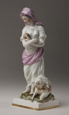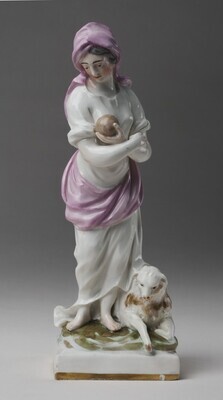Die Frau steht auf einem quadratischen Sockel, zu ihren nackten Füßen liegt ein Lamm. Ihre Arme hat sie vor dem Oberkörper miteinander verschränkt. In der linken Hand hält sie eine bräunliche Kugel, auf die ihr Blick gerichtet ist. Gekleidet ist sie in ein weißes Kleid mit rosa Tüchern um Hüfte und Kopf geschlungen. Es könnte sich um eine Darstellung der römischen Göttin der Baumfrüchte, Pomona handeln. Blaumarke CT.