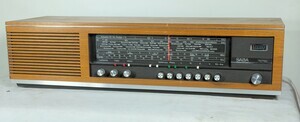 Nach dem Siegeszug der Transistoren im Radiobau wurden, dieGeräte deutlich kleiner und niedriger. Unser Gerät hat nur noch eine Höhe von 15 cm und passt in jedes Bücherregal. Das Gehäuse ist aus Holz und Nussbaum naturhell furniert. Der Lautsprecher ist linkseitig, hinter querverlaufenden, lamellenartigen Schlitzen, eingebaut. Daneben die Glasscheibe mit der aufgedruckten Senderskala. Unterhalb sind 10 Druckknöpfe angeordnet mit deren Hilfe die Einstellungen erfolgen. Mit dem großen Drehknopf erfolgt die Senderwahl. Mit den bunten, verschiebbaren Plastikpfeile lassen sich einzelne Sender, zur schnelleren Auffindung, markieren. Rückseitig gibt es Anschlüsse für Plattenspieler, Tonband, Zweitlautsprecher, Antenne und Erde.