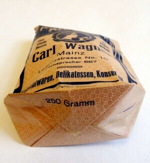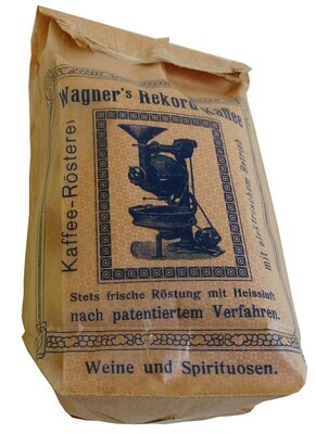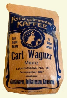 Paket aus Packpapier mit Kaffebohnen, 250 g mit der Aufschrift der Produktionsfirma, deren Logo und Adresse sowie einiger Qualitätsmerkmale. (s. Fotos der Vorder- und Rückseite der Packung) Die Kaffeerösterei Carl Wagner aus Mainz vertrieb neben Kaffee noch Kolonialwaren, Delikatessen, Konserven, Weine und Spirituosen.