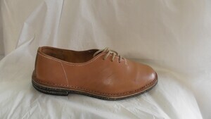 Ein einzelner Herrenhalbschuh aus braunem Leder. Spitze Form, Blockabsatz (ca. 2,5cm), Lochschnürung mit Lasche am Einstieg. Das Obermaterial besteht größtenteils aus miteinander verflochtenen Lederstreifen. Herrengröße 11. Auf dem Schuh klebt das originale Preisschild: 49.50 DM. Hergestellt von der Firma Salamander in Kornwestheim (D). Leider sehr ungenau datiert.