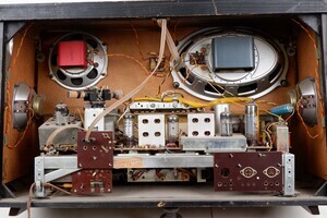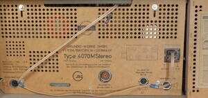 Ein Grundig Röhrenempfänger von 1964. Das Gehäuse ist, bis auf die Senderskala, aus Teakholz gefertigt. Die Glasscheibe mit aufgedruckter Senderskala ist weiß/grau. Der Hersteller hat in sie sieben Drucktasten und drei Drehregler zur Bedienung integriert. Das Radio verfügt über zwei Lautsprecher. Rückseitig sind Anschlüsse für Tonband, Plattenspieler und Stereo Lautsprecher vorgesehen. Stereo Lautsprecher deshalb, weil das Gerät für den Einbau eines Stereo Decoders vorgesehen ist. (Ein Stereo Decoder decodiert das von Sender ausgestrahlte stereophone Tonsignal, in einen rechten und linken Kanal)