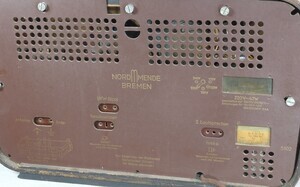 NordMende stellte in den Jahren 1951/1952 dieses, formschöne Radio her. Der Korpus, hellbraun furniert, ist an den Ecken abgerundet. An der Vorderseite betonen, rundum verlaufende, goldfarbene Metallsteifen, den äußeren Rand. Das Gleiche wiederholt rund um die Öffnung, von Lautsprecher und Sendeskala. Der große Lautsprecher von 18 cm Durchmesser verbirgt sich hinter einer Stoffabdeckung. Darunter die dunkle Glasscheibe mit den aufgedruckten Sendestationen. Ein magisches Auge sowie zwei große Drehregler (Ein/Aus, Lautstärke und Senderwahl) runden das gesamt Bild ab. Die Wellenbereiche und der Plattenspieler werden durch einen seitlich angebrachten Drehregler eingestellt. Für rund 330 DM konnte das Gerät 1951 im Laden gekauft werden. Unser Gerät hat noch das Original, stoffumwickelte, Anschlusskabel. Etwas Irreführend ist die Zusatzbezeichnung "Bremen" Dabei handelt es sich nicht um die Typenbezeichnung sondern um den Standort der Firma.