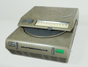 1949 wurde von der Firma Assmann das erste Diktiergerät auf Magnet-Tontechnik vorgestellt. Doch es dauerte noch einige Jahre bis sich die neue Technik in den Firmen durch setzte. Statt Stenografie Block reichte nun ein Mikrofon. Als Tonträger diente eine Kunststoffplatte (ähnlich einer 78er Schallplatte) in die beiderseits Rillen eingepresst waren, die zur Aufnahme der Magnetschicht, sowie der Führung des Tonkopfes diente. Die Umdrehungszahl war mit 15 U/pM. deutlich niedriger als beim Plattenspieler. Bei unserem Gerät handelt es sich um ein reines Abspielgerät. Die Schreibkraft hatte die Möglichkeit sich den Text über Kopfhörer anzuhören und niederzuschreiben. Ein mitgelieferter Fußhebel gestattete der Schreibkraft eine Unterbrechung bzw. eine Wiederholung bestimmter Stellen.