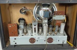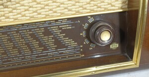 1889 gründeten Max Körting in Leipzig das Unternehmen. Nach dem Krieg wurde der Firmensitz nach Grassau/Chiemgau verlagert. Körting produziert Radios unter eigenem Namen, primär aber für andere deutsche Firmen wie Siemens, Blaupunkt, Elac und den Versandhändler Neckermann. Unser Gerät von Körting wurde 1953/1954 hergestellt und hat alle äußeren Merkmale dieser Zeit. Das Chassis ist komplett aus Holz. Die Stoffabdeckung verbirgt den Lautsprecher. Darunter die Sendeskala die beiderseits durch Drehregler flankiert wird. Beide Regler haben eine Doppelfunktion. Mit dem kleinen bzw. größeren Rad links, lässt sich das Gerät einschalten, die Lautstärke und die Klangfarbe regeln. Der rechte Drehknopf dient der Senderwahl und der Wellenbereiche UKW/MW/LW/KW schalten sowie der Plattenspieler. Rückseitig sind Anschlüsse für Plattenspieler, Zweitlautsprecher, Erde und Antenne. 1953 kostete das Gerät 278 DM