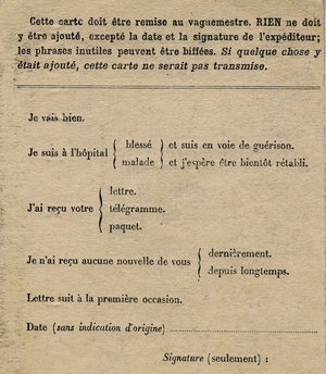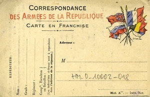 Karte im Querformat Vorderseite: unbeschrifteter Adressvordruck, französischer Text: "Correspondance / des Armées de la République / Carte en Franchise", Abbildung: 6 Landesfahnen, Künstlersignatur: "Stern. G", unten rechts: "Mod. A(...). - Impr. Nat."; Rückseite: aufgedruckte Textvorlage mit Antwortmöglichkeiten zum Markieren: "Cette carte doit être remise au vaguemestre. RIEN ne doit y étre ajouté, excepté la date et la signature de l’expéditeur; les phrases inutiles peuvent être biffées. Sie quelque chose y était ajouté, cette carte ne serait pas transmise. / Je vais bien. / Je suis à l’hôpital {blessé / malade} et suis en voie de guérison. / et j’espère être bientôt rétabli. / J’ai recu votre { lettre. / télégramme. / paquet. / Je n’ai recu aucune nouvelle de vous { dernièrement. / depuis longtemps. / Lettre suit à la première occasion. / Date (sans indication d’origine) / Signature (seulement):" - Übersetzung: "Diese Karte muss beim Postmeister eingeliefert werden. Es darf NICHTS hinzugefügt werden, außer des Datums und der Unterschrift des Absenders; die unbenötigten Sätze können durchgestrichen werden. Wenn etwas hinzugefügt sein sollte, wird die Karte nicht ausgeliefert werden. / Es geht mir gut. / Ich bin {verletzt / krank} im Krankenhaus und ich bin auf dem Weg der Besserung. / und ich hoffe, bald wieder genesen zu sein. / Ich habe euer/en {Brief / Telegramm / Paket} erhalten. / Ich habe {in letzter Zeit / seit langer Zeit} keine Neuigkeiten von euch erhalten. / Brief folgt bei nächster Gelegenheit. / Datum (ohne Herkunftsangabe) / Unterschrift (nur):", unbeschriftet; ungelaufen