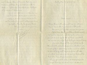 Vierseitiger Brief mit Umschlag. Umschlag: Stempel: "12e Régiment de Chasseurs - Le conseil (...)", handschriftlich: "Correspondance Militaire", Adressat: " Mademoiselle Hortense Jacquemin / chez ses parents / à / Senonville / Meuse". Der Brief ist handschriftlich geschrieben. Transkription: "Mon(…)ville le 29. Août 1914 Chère amie Depuis Hennemont (…) (…) j’ai fait vous sommer des nouvelles bien des choses se sont passés. Nous avons pris l’offensive mais après deux jours de luttes l’on a été obligé de battre un retraite devant des forces bien superieures on marche quatre contre (cent) à peu près et aujourd’hui les côtés de Meuse nous (...) car nous sommes en repos toute la brigade arrive Verdun. J’ai vu le village de Pillon qui fut brulé par les Allemands dès la declaration de guerre ca fait pitié il reste neuve quelques maisons et neuve bien mauvaises a habité le clocher et l’horloge sont traversés de plus de cent balles ce n’est ni plus ni moins que des sauvages ils achevent les blessés et ne prennent (...) aux prisonniers. Longu(...) qui avait été perdu vient à être repris par les francais. Quant bien au côté de l’armée suite dans une bataille les Allemands ont perdu 12000 hommes. (...) un gros courrier a été pris avec 1100 hommes et il y avait 2000 prisonniers francais maintenant ce renseignement n’est pas officiel enfin je vois que tout va bien et qu’ils ne passeront pas les côtés de Meuse car l’on (...) de reprendre l’offensive. Nous allons probablement quitté la Meuse pour la Belgique rejoindre l’armée du Nord le 20e chasseurs qui force brigade avec nous embarque a Verdun aujourd’hui a 3 heures. J’ai recu votre lettre avec cette petite feuille au livre a laquelle je tiens beaucoup car ca me rappelle au bien doux moments ou l’on ne pense pas a la guerre. Je pense pouvoir la conserver sans la (...) et a la rapporter si toutefois rien de fâcheux n’arrive car aujourd’hui l’on est en (...) mais demain que nous reserve la pour (...), mais espérons. J’ai recu des nouvelles assez rassurants de (...), qui m’ont fait grande plaisir. Je crois que Charles (Taufmont) a été tué dans le combat de Billy les (Mangimes) j’ai demandé après sa (...) l’on ma répondu qu’elle avait été fauchée dans l’après midi par les mitrailleuses mais m’en parlé a personne je voudrais pouvoir savoir si c’est bien vrai quand j’ai recueilli cette nouvelle il était une heure du matin et la bataille avait eut lieu dans la journée et en sentant il se pense très bien que ce soit faux ce serait a souhaiter. (Ernest Lomich) a eût le nez (...) par une ballu je l’ai vu hier mais ce n’est rien. Il y a des blessés qui font (...) (a rien) j’en ai vu un qui avait un éclat d’obus dans la jambe et pour tenir la jambe qui était fracasséd il s’était lié tout ca avec du fil de fer enfin c’est la guerre chacun doit (...) son (destin). Je ne veux pas m’étendre plus loin pour de faire pleurer nos (...) yeux car j’aime bien de les voir souriants et plein de joie. Je pense que tout le monde se porte bien ainsi que vous-même. (notre maison) doit s’(...) heureusement qu’il fait beau et que les (...) des champs n’ont pas été dérangés comme sur la frontière ou tout (n’a resté) tout le monde est parti tout les villages sont vides. Je crois que maintenant la guerre ne durera pas longtemps deux mois ou plus mais j’espère (rentrer) vers le mois Novembre ou Decembre ou plus tard si je ne suis pas mort ou blessé ou prisonnier à la volonté au très haut et je vis dans l’esperance. Je ne vois plus rien a vous dire je me porte toujours bien et demande a (achever) la campagne dans le même etat de (...) car l’on (...) plus souvent parterre que dans la (...). Bien le bonjour à tous (...) qui vous aime pour la vie (...)". Übersetzung: "Mon(…)ville, den 29. August 1914 Liebe Freundin Seit Hennemont (…) (…) habe ich Ihnen Neuigkeiten mitgeteilt, viele Dinge sind passiert. Wir haben die Offensive übernommen, aber nach 2 Tagen Kampf waren wir gezwungen den Rückzug zu erkämpfen vor den überlegenen Kräften, wir laufen vier gegen (hundert) ungefähr, heute (...) uns die Seiten der Meuse, denn wir sind im Ruhezustand, die ganze Brigade kommt in Verdun an. Ich habe das Dorf Pillon gesehen, welches von den Deutschen abgebrannt wurde seit der Kriegserklärung, das bringt Mitleid, es bleiben ungefähr neun Häuser und neun schlecht zu bewohnende, der Glockenturm und die Uhr wurden mit mehr als hundert Kugeln durchschossen, das sind nicht mehr und nicht weniger als die Wilden, sie richten die Verwundeten zugrunde und nehmen nicht (...) auf die Gefangenen. (...) was verloren wurde, wurde gerade von den Franzosen zurückerobert. Seitens der Armee haben die Deutschen in einem Kampf 12000 Männer verloren. (...) ein großes Schreiben wurde mit 1100 Männern gemacht und es gab jetzt 2000 französische Gefangene, diese Information ist nicht offiziell, schließlich sehe ich, dass alles gut läuft und sie nicht die Seiten der Meuse passieren werden, denn wir (...) die Offensive wieder aufzunehmen. Wir werden wahrscheinlich die Meuse verlassen, um nach Belgien zu gehen und uns dort der nördlichen Armee anzuschließen, der 20. Jägerabteilung, die mit uns die Brigade durchbricht, Verladung nach Verdun heute um 3 Uhr. Ich habe Ihren Brief mit der kleinen Buchseite erhalten, an der ich sehr hänge, denn das erinnert mich an gute sanfte Momente, in denen man nicht an Krieg denkt. Ich denke, sie ohne die (...) aufbewaren zu können und sie jedesmal, wenn nichts böses passiert, mitzunehmen, denn heute sind wir in (...) aber morgen wird dies uns für (...) reserviert sein, aber hoffen wir. Ich habe ziemlich beruhigende Neuigkeiten von (...) erhalten, die mir große Freude bereitet haben. Ich glaube das Charles (Taufmont) im Kampf in Billy getötet wurde, ich habe nach seiner (...) gefragt, man hat mir geantwortet