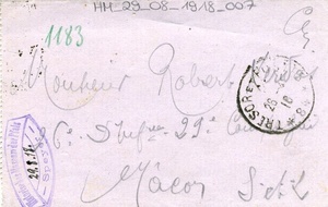 Kartenteil. Auf der Vorderseite: Adressat: "Monsieur Robert (Kerdas) / 26e d’infanterie - 29e compagnie / (…) (…)", Stempel: "Tresor et Postes 84 / 26 - 4 / 16", [mit grünem Buntstift:] "1183". Auf der Rückseite ein handschriftlicher Text: Transkription: "… que nous (…) sommes pas trop suremené, avec cela j’ai beaucoup de plaisir d’etre pres de vos pere tu peux croire que nous passons de bons moments chez ta Femme il (…) peut-etre releve pour une (trentaine) mais il ne quite pas le secteur. / Je te laisse mon vieux Robert en te souhaitant (...) (...) on t’embrasse / ton (...)". Übersetzung: "… dass wir (…) nicht zu überarbeitet sind, ich habe damit viel Freude, in der Nähe deines Vaters zu sein, du kannst glauben, dass wir gute Momente bei deiner Frau verbringen, er (…) vielleicht wieder aufgerichtet für (ungefähr dreißig), aber er verlässt den Sektor nicht. / Ich lasse dich mein alter Robert und wünsche dir (...) (...) wir umarmen dich / dein (...)".