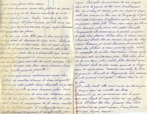 Gefalteter, vierseitiger Brief. Absender: Mademoiselle Angèle (Dorangeon) / 5 Avenue Marceau 5 / Les Barboussèdes / Toulon (Var), Adressat: "Monsieur Marcel Ponthieux / Sergent au 287e régiment / d’Infanterie, 21e Compagnie / Secteur postale 103", handschriftlicher Text, am Rand: Markierungen mit Buntstift. Transkription: "Toulon le 3 Février 1916 / Mon bien cher filleul / C’est avec un très grand plaisir que j’ai pris connaissance de votre aimable lettre du 25 et je vous en remercie beaucoup. / Marie-Rose a recu ce matin votre lettre dont elle est très contente. Vous avez le don mon cher filleul Marcel, de nous faire rire et vous vous y entendez à merveille. Vous êtes très amusant!.. Marie-Rose va vous écrire mais pas aujourd’hui car je vous écris. Un autre jour quand elle aura le temps comme cela vous les recevrez séparément. Je leur avais déjà dit à mes deux soeurs de vous écrire à des jours différents afin que vous ne recevrez pas les lettres ensemble. Car on a plus de plaisir à en avoir tous les jours que tout en même temps. Du moins c’est mon idée et c’est pourquoi je leur avais déjà dit cela. Désormais nous ferons donc ainsi. / Je suis heureuse mon cher filleul de savoir que vous avez eu de bonnes nouvelles de votre pauvre grand mère. Enfin! Vous avez dû être bien content. Il faut espérer qu’elle aura un mieux qui se maintaindra et que définitivement elle reprendra des forces. / J’ai vu par votre lettre que le bon curé de Crézancy avait été heureux de vous revoir. Cela se comprend qu’il vous aime bien et puis il y a bien longtemps qu’il vous connaît cela a dû être une joie pour lui à ce vénérable curé aussi dans son transport il vous a embrassé comme un frère que vous êtes du reste puisque l’Evangile dit que sur terre nous sommes tous frères. Quelle grande famille!... / Je vous approuve entièrement mon cher filleul de vouloir donner le beau chapelet tricolore à votre petite chérie Marcelle; et je suis bien sûre qu’elle en sera heureuse plus tard. D’abord parce que ce sera un souvenir précieux de son papa qui l’aura eu avec lui pendant toute la campagne où il aura combattu si vaillamment. A ce chapelet donc se rattacheront de grands et ineffacables souvenirs. Puis outre les souvenirs de son papa chéri de la guerre il lui sera doublement cher car il aura été donné par un saint et vénérable curé comme ce bon curé de Crézancy et qui doit avoir beaucoup d’affection aussi pour votre mignonne petite fille. Donc vous voyez qu’elle en sera heureuse plus tard votre petite Marcelle. / Raymonde elle aussi aura de gentils souvenirs et votre chère femme Aline aura le choix aussi. Sans une doute elles en seront toutes très heureuses. Comme je serais heureuse et contente mon cher filleul si vous pouviez enfin avoir des nouvelles de ces êtres tant aimés. Aussi espérons que cela ne tardera pas. Votre chère femme et vos deux jolies petites filles doivent avoir tellement hâte de vous revoir après de si longs mois de séparation! Comme vous allez les trouver grandes Marcelle et Raymonde; cela pousse si vite quand c’est petit! Aussi vous en serez fier. / Il a plu toute cette nuit mais on dirait que le temps veut se remettre au beau. / Dimanche je me promenais sur le port avec ma tante et nous avons vu un officier Serbe. Il était très bien. Grand, bien bâti, portant on ne peut mieux l’uniforme, avec une figure énergique et de grands yeux noirs. Puis nous avons vu aussi un soldat. L’officier était décoré et parlait avec un des nôtres. Si tous leurs compatriotes ressemblent à ces deux Serbes, ce sont vraiment de beaux hommes. A propos, dans un des faubourgs de Toulon il y a en ce moment un petit Serbe de 8 ans qui se meurt pour avoir pris un fusil et défendu son pays. Quel héroisme! Quel peuple admirable! Les Belges et les Serbes peuvent se donner la main! Les femmes, les enfants, les vieillards, tous ont fait le coup de feu. Il y a quelques jours ou on a enterré un petit de 18 ans!.. / Votre frère Maurice ne va pas tarder il va nous apporter de vos nouvelles. / Je m’en vais vous quitter pour ce soir mon bien cher filleul car j’ai un mal de tête fou. / Maman vous envoie son bon souvenir. En attendant de vos nouvelles mon cher filleul je vous embrasse bien affectueusement. / Votre dévouée petite marraine. / Angèle (Dorangeon)". Übersetzung "Toulon, den 3. Februar 1916 / Mein lieber Patensohn / Mit sehr großer Freude nahm ich Kenntnis von Ihrem liebenswürdigen Brief vom 25. und ich danke Ihnen sehr. / Marie-Rose hat heute morgen Ihren Brief erhalten, über den sie sehr glücklich ist. Ihr habt die Gabe, mein lieber Patensohn Marcel, uns zum Lachen zu bringen und davon verstehen Sie sehr viel. Sie sind sehr amüsant!.. Marie-Rose wird Ihnen schreiben, aber nicht heute, denn ich schreibe Ihnen. An einem anderen Tag, wenn sie die Zeit hat, erhalten Sie einen separaten Brief. Ich hatte schon meinen zwei Schwestern gesagt, dass sie Ihnen an unterschiedlichen Tagen schreiben sollen, damit Sie die Briefe nicht zusammen erhalten. Denn man hat mehr Freude einen jeden Tag zu haben als alle zur gleichen Zeit. Wenigstens ist es meine Idee und deshalb habe ich es ihnen schon gesat. Von nun an machen wir das nun so. / Ich bin glücklich, mein lieber Patensohn, zu wissen, dass gute Neuigkeiten von Ihrer armen Großmutter erhalten haben. Endlich! Sie müssen sehr glücklich gewesen sein. Man muss hoffen, dass es ihr besser gehen wird und dass es aufrecht gehalten wird und sie endlich wieder zu Kräften kommt. / Ich habe durch Ihren Brief gesehen, dass der gute Pfarrer von Crézancy sehr glücklich gewesen ist, Sie wiederzusehen. Das versteht sich, dass er sie gern hat und dazu ist es eine lange Zeit, dass er Sie kennt, das muss eine Freude für ihn gewesen sein, für diesen ehrwürdigen Pfarrer bei seinem Transport, er hat Sie umarmt wie einen Bruder, der er Ihnen übrigens ist, weil das Evangel