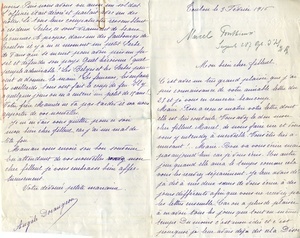 Gefalteter, vierseitiger Brief. Absender: Mademoiselle Angèle (Dorangeon) / 5 Avenue Marceau 5 / Les Barboussèdes / Toulon (Var), Adressat: "Monsieur Marcel Ponthieux / Sergent au 287e régiment / d’Infanterie, 21e Compagnie / Secteur postale 103", handschriftlicher Text, am Rand: Markierungen mit Buntstift. Transkription: "Toulon le 3 Février 1916 / Mon bien cher filleul / C’est avec un très grand plaisir que j’ai pris connaissance de votre aimable lettre du 25 et je vous en remercie beaucoup. / Marie-Rose a recu ce matin votre lettre dont elle est très contente. Vous avez le don mon cher filleul Marcel, de nous faire rire et vous vous y entendez à merveille. Vous êtes très amusant!.. Marie-Rose va vous écrire mais pas aujourd’hui car je vous écris. Un autre jour quand elle aura le temps comme cela vous les recevrez séparément. Je leur avais déjà dit à mes deux soeurs de vous écrire à des jours différents afin que vous ne recevrez pas les lettres ensemble. Car on a plus de plaisir à en avoir tous les jours que tout en même temps. Du moins c’est mon idée et c’est pourquoi je leur avais déjà dit cela. Désormais nous ferons donc ainsi. / Je suis heureuse mon cher filleul de savoir que vous avez eu de bonnes nouvelles de votre pauvre grand mère. Enfin! Vous avez dû être bien content. Il faut espérer qu’elle aura un mieux qui se maintaindra et que définitivement elle reprendra des forces. / J’ai vu par votre lettre que le bon curé de Crézancy avait été heureux de vous revoir. Cela se comprend qu’il vous aime bien et puis il y a bien longtemps qu’il vous connaît cela a dû être une joie pour lui à ce vénérable curé aussi dans son transport il vous a embrassé comme un frère que vous êtes du reste puisque l’Evangile dit que sur terre nous sommes tous frères. Quelle grande famille!... / Je vous approuve entièrement mon cher filleul de vouloir donner le beau chapelet tricolore à votre petite chérie Marcelle; et je suis bien sûre qu’elle en sera heureuse plus tard. D’abord parce que ce sera un souvenir précieux de son papa qui l’aura eu avec lui pendant toute la campagne où il aura combattu si vaillamment. A ce chapelet donc se rattacheront de grands et ineffacables souvenirs. Puis outre les souvenirs de son papa chéri de la guerre il lui sera doublement cher car il aura été donné par un saint et vénérable curé comme ce bon curé de Crézancy et qui doit avoir beaucoup d’affection aussi pour votre mignonne petite fille. Donc vous voyez qu’elle en sera heureuse plus tard votre petite Marcelle. / Raymonde elle aussi aura de gentils souvenirs et votre chère femme Aline aura le choix aussi. Sans une doute elles en seront toutes très heureuses. Comme je serais heureuse et contente mon cher filleul si vous pouviez enfin avoir des nouvelles de ces êtres tant aimés. Aussi espérons que cela ne tardera pas. Votre chère femme et vos deux jolies petites filles doivent avoir tellement hâte de vous revoir après de si longs mois de séparation! Comme vous allez les trouver grandes Marcelle et Raymonde; cela pousse si vite quand c’est petit! Aussi vous en serez fier. / Il a plu toute cette nuit mais on dirait que le temps veut se remettre au beau. / Dimanche je me promenais sur le port avec ma tante et nous avons vu un officier Serbe. Il était très bien. Grand, bien bâti, portant on ne peut mieux l’uniforme, avec une figure énergique et de grands yeux noirs. Puis nous avons vu aussi un soldat. L’officier était décoré et parlait avec un des nôtres. Si tous leurs compatriotes ressemblent à ces deux Serbes, ce sont vraiment de beaux hommes. A propos, dans un des faubourgs de Toulon il y a en ce moment un petit Serbe de 8 ans qui se meurt pour avoir pris un fusil et défendu son pays. Quel héroisme! Quel peuple admirable! Les Belges et les Serbes peuvent se donner la main! Les femmes, les enfants, les vieillards, tous ont fait le coup de feu. Il y a quelques jours ou on a enterré un petit de 18 ans!.. / Votre frère Maurice ne va pas tarder il va nous apporter de vos nouvelles. / Je m’en vais vous quitter pour ce soir mon bien cher filleul car j’ai un mal de tête fou. / Maman vous envoie son bon souvenir. En attendant de vos nouvelles mon cher filleul je vous embrasse bien affectueusement. / Votre dévouée petite marraine. / Angèle (Dorangeon)". Übersetzung "Toulon, den 3. Februar 1916 / Mein lieber Patensohn / Mit sehr großer Freude nahm ich Kenntnis von Ihrem liebenswürdigen Brief vom 25. und ich danke Ihnen sehr. / Marie-Rose hat heute morgen Ihren Brief erhalten, über den sie sehr glücklich ist. Ihr habt die Gabe, mein lieber Patensohn Marcel, uns zum Lachen zu bringen und davon verstehen Sie sehr viel. Sie sind sehr amüsant!.. Marie-Rose wird Ihnen schreiben, aber nicht heute, denn ich schreibe Ihnen. An einem anderen Tag, wenn sie die Zeit hat, erhalten Sie einen separaten Brief. Ich hatte schon meinen zwei Schwestern gesagt, dass sie Ihnen an unterschiedlichen Tagen schreiben sollen, damit Sie die Briefe nicht zusammen erhalten. Denn man hat mehr Freude einen jeden Tag zu haben als alle zur gleichen Zeit. Wenigstens ist es meine Idee und deshalb habe ich es ihnen schon gesat. Von nun an machen wir das nun so. / Ich bin glücklich, mein lieber Patensohn, zu wissen, dass gute Neuigkeiten von Ihrer armen Großmutter erhalten haben. Endlich! Sie müssen sehr glücklich gewesen sein. Man muss hoffen, dass es ihr besser gehen wird und dass es aufrecht gehalten wird und sie endlich wieder zu Kräften kommt. / Ich habe durch Ihren Brief gesehen, dass der gute Pfarrer von Crézancy sehr glücklich gewesen ist, Sie wiederzusehen. Das versteht sich, dass er sie gern hat und dazu ist es eine lange Zeit, dass er Sie kennt, das muss eine Freude für ihn gewesen sein, für diesen ehrwürdigen Pfarrer bei seinem Transport, er hat Sie umarmt wie einen Bruder, der er Ihnen übrigens ist, weil das Evangel