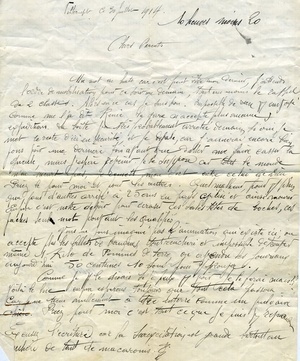 Dem Adressat des Briefes, Alfred Brunel, wurde am 20. Februar 1915 in deutscher Gefangenschaft dieser Brief seines Sohnes abgenommen. Ein Jahr später, 10. Februar 1916, wird er 58-jährig auf einer Liste für die Repatriierung über die Schweiz ins unbesetzte Frankreich geführt. Zuletzt war er in Würzburg und Traunstein interniert gewesen. Zweiseitiger Brief Umschlag: Adressat: "Madame Brunel / Entrepreneur / 71 Rue des (…) / Pagny sur Moselle", [in roter Schrift:] "Alfred Brunel / abgenommen / 20 II 15", 2 Stempel: "Villerupt - Meurthe et Moselle / 31 - 7 / 14", Briefmarke: "Republique Francaise 10c - Postes"; beiliegende Visitenkarte: "A. Brunel Entrepreneur de maconnerie [Bauunternehmer] / Pagny-sur-Moselle"; Brief: handschriftlicher Text Transkription "Villerupt le 30 Juillet 1914 / 10 heures moins 20 / Chers parents / Un mot en hate car c’est peut être mon dernier, j’attends l’ordre de mobilisation pour ce jour ou demain, tout au moins le rappel de 2 classes. Alors en ce cas je suis bon. Impossible de rien vous emporté comme me l’a dit Reneé, la gare n’accepte plus aucune expedition. La boîte vas très probablement arreteé demain, si oui, je met le reste d’ici en securité, et je (...), car j’aimerai encore bien vous voir une dernière fois avant que d’aller me faire latter la gueule, mais j’espère revenir. Je le suppose car tout le monde n’en meurt pas, je remets mon sort (?) entre celui de dieu. Priez le pour moi et pour les autres. Quel malheur, pour vous plus que pour d’autres arreté à 25 ans en pays (civilisé) et ainsi mourir. Enfin c’est notre devoir pour écraser ces sales têtes de boches, ces vaches seul mot pouvant les qualifiés. Vous ne vous imaginé pas l’animation qui existe ici, on accepte plus les billets de banques, tout renchéri et impossible de trouver même 1 kilo de pommes de terre on a vendu les journaux aujourd’hui 50 centimes 10 sous, pour vous trouver. Comme je vous le dirais si je peux vous voir je le ferai ouai! Voilà le hier enfin esperons toujours que tout cela passera. Car je me tiens nullement à être enterré comme un vulgaire chien. Priez pour moi c’est tout ce que je puis vous répondre. Excusez l’ecriture car la surexcitation est grande. (...) Je termine en vous embrassant. Conservez bien cette dernière (?) car peut être c’est ma dernière. Bien à vous. Brunel Je vous en prie ne vous (...) pas, il faut en prendre son parti, rappelons nous la Chanson de Berenger Mourir pour la Patrie Seulement soyez (sûr?) que si j’y laisse ma peau, j’aurai crevé la panse à quelques Boches. Je ne vous dit pas adieu car je pense revenir mais au revoir. Je vous embrasse. Votre fils et frère Brunel Destinateur (...) Metallurgique D’(...) Villerupt Dernière nouvelle de Paris par téléphone. La (destination?) est desormais desespoire" Übersetzung "Villerupt, den 30. Juli 1914 / 20 vor 10 / Liebe Eltern / Ein Wort in Eile, denn es könnte mein letztes sein, ich erwarte den Mobilisationsbefehl für heute oder morgen, mindestens der Aufruf von zwei Klassen. Also, in diesem Fall bin ich gut / bin ich dabei (?). Unmöglich, euch etwas mitzubringen, wie Renée mir gesagt hat, der Bahnhof akzeptiert keinen Versand mehr. Die Dose wird morgen wahrscheinlich nicht angehalten, wenn doch, bringe ich den Rest von hier in Sicherheit und ich (...), denn ich würde euch gern noch ein letztes Mal sehen, bevor ich mir die Schnauze polieren lasse, aber ich hoffe, zurückzukommen. Ich vermute es, denn es sterben nicht alle, ich lege mein Schicksal in das von Gott. Erbetet das für mich und für die anderen. Welches Unglück, für euch mehr als für die anderen, mit 25 Jahren angekommen in einem zivilisierten Land und so sterben. Schließlich ist es unsere Aufgabe, diese schmutzigen Deutschenköpfe zu zerschlagen, diese Ungehaltenen, das einzige Wort, das sie beschreiben kann. Ihr stellt euch den Betrieb hier nicht vor, es werden keine Bankscheine mehr akzeptiert, alles verteuert sich und es ist unmöglich überhaupt ein Kilo Kartoffeln zu finden, wir haben heute Zeitungen für 10 Cent und 50 Sous verkauft, um euch zu finden. Wie ich euch sage, wenn ich euch sehen kann, dann werde ich es tun, ja! Seht das Gestern, hoffen wir, dass das alles vorbeigeht. Denn ich halte mich nicht daran fest, wie ein vulgärer Hund eingegraben zu sein. Betet für mich, das ist alles, was ich euch antworten kann. Entschuldigt die Schrift, denn die Überreiztheit ist groß. (...) Ich beende den Brief, indem ich euch umarme. Behaltet diesen Brief (?) denn vielleicht ist es mein letzter. Macht es gut. Brunel. Ich bitte euch, (...) euch nicht, man muss seinen Platz finden (?), erinnern wir uns an das ’Chanson de Berenger’ Sterben für das Vaterland Seid euch sicher, dass, wenn ich sterbe, ein paar Deutschen die Bäuche zum Platzen gebracht habe. Ich sage euch nicht Adieu, weil ich denke, zurückzukommen, aber Auf Wiedersehen. Ich umarme euch. Euer Sohn und Bruder Brunel.".