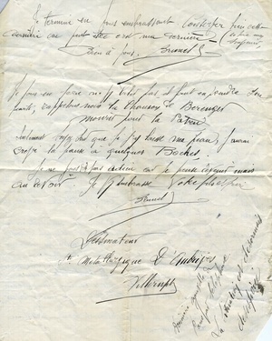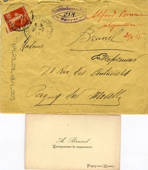 Dem Adressat des Briefes, Alfred Brunel, wurde am 20. Februar 1915 in deutscher Gefangenschaft dieser Brief seines Sohnes abgenommen. Ein Jahr später, 10. Februar 1916, wird er 58-jährig auf einer Liste für die Repatriierung über die Schweiz ins unbesetzte Frankreich geführt. Zuletzt war er in Würzburg und Traunstein interniert gewesen. Zweiseitiger Brief Umschlag: Adressat: "Madame Brunel / Entrepreneur / 71 Rue des (…) / Pagny sur Moselle", [in roter Schrift:] "Alfred Brunel / abgenommen / 20 II 15", 2 Stempel: "Villerupt - Meurthe et Moselle / 31 - 7 / 14", Briefmarke: "Republique Francaise 10c - Postes"; beiliegende Visitenkarte: "A. Brunel Entrepreneur de maconnerie [Bauunternehmer] / Pagny-sur-Moselle"; Brief: handschriftlicher Text Transkription "Villerupt le 30 Juillet 1914 / 10 heures moins 20 / Chers parents / Un mot en hate car c’est peut être mon dernier, j’attends l’ordre de mobilisation pour ce jour ou demain, tout au moins le rappel de 2 classes. Alors en ce cas je suis bon. Impossible de rien vous emporté comme me l’a dit Reneé, la gare n’accepte plus aucune expedition. La boîte vas très probablement arreteé demain, si oui, je met le reste d’ici en securité, et je (...), car j’aimerai encore bien vous voir une dernière fois avant que d’aller me faire latter la gueule, mais j’espère revenir. Je le suppose car tout le monde n’en meurt pas, je remets mon sort (?) entre celui de dieu. Priez le pour moi et pour les autres. Quel malheur, pour vous plus que pour d’autres arreté à 25 ans en pays (civilisé) et ainsi mourir. Enfin c’est notre devoir pour écraser ces sales têtes de boches, ces vaches seul mot pouvant les qualifiés. Vous ne vous imaginé pas l’animation qui existe ici, on accepte plus les billets de banques, tout renchéri et impossible de trouver même 1 kilo de pommes de terre on a vendu les journaux aujourd’hui 50 centimes 10 sous, pour vous trouver. Comme je vous le dirais si je peux vous voir je le ferai ouai! Voilà le hier enfin esperons toujours que tout cela passera. Car je me tiens nullement à être enterré comme un vulgaire chien. Priez pour moi c’est tout ce que je puis vous répondre. Excusez l’ecriture car la surexcitation est grande. (...) Je termine en vous embrassant. Conservez bien cette dernière (?) car peut être c’est ma dernière. Bien à vous. Brunel Je vous en prie ne vous (...) pas, il faut en prendre son parti, rappelons nous la Chanson de Berenger Mourir pour la Patrie Seulement soyez (sûr?) que si j’y laisse ma peau, j’aurai crevé la panse à quelques Boches. Je ne vous dit pas adieu car je pense revenir mais au revoir. Je vous embrasse. Votre fils et frère Brunel Destinateur (...) Metallurgique D’(...) Villerupt Dernière nouvelle de Paris par téléphone. La (destination?) est desormais desespoire" Übersetzung "Villerupt, den 30. Juli 1914 / 20 vor 10 / Liebe Eltern / Ein Wort in Eile, denn es könnte mein letztes sein, ich erwarte den Mobilisationsbefehl für heute oder morgen, mindestens der Aufruf von zwei Klassen. Also, in diesem Fall bin ich gut / bin ich dabei (?). Unmöglich, euch etwas mitzubringen, wie Renée mir gesagt hat, der Bahnhof akzeptiert keinen Versand mehr. Die Dose wird morgen wahrscheinlich nicht angehalten, wenn doch, bringe ich den Rest von hier in Sicherheit und ich (...), denn ich würde euch gern noch ein letztes Mal sehen, bevor ich mir die Schnauze polieren lasse, aber ich hoffe, zurückzukommen. Ich vermute es, denn es sterben nicht alle, ich lege mein Schicksal in das von Gott. Erbetet das für mich und für die anderen. Welches Unglück, für euch mehr als für die anderen, mit 25 Jahren angekommen in einem zivilisierten Land und so sterben. Schließlich ist es unsere Aufgabe, diese schmutzigen Deutschenköpfe zu zerschlagen, diese Ungehaltenen, das einzige Wort, das sie beschreiben kann. Ihr stellt euch den Betrieb hier nicht vor, es werden keine Bankscheine mehr akzeptiert, alles verteuert sich und es ist unmöglich überhaupt ein Kilo Kartoffeln zu finden, wir haben heute Zeitungen für 10 Cent und 50 Sous verkauft, um euch zu finden. Wie ich euch sage, wenn ich euch sehen kann, dann werde ich es tun, ja! Seht das Gestern, hoffen wir, dass das alles vorbeigeht. Denn ich halte mich nicht daran fest, wie ein vulgärer Hund eingegraben zu sein. Betet für mich, das ist alles, was ich euch antworten kann. Entschuldigt die Schrift, denn die Überreiztheit ist groß. (...) Ich beende den Brief, indem ich euch umarme. Behaltet diesen Brief (?) denn vielleicht ist es mein letzter. Macht es gut. Brunel. Ich bitte euch, (...) euch nicht, man muss seinen Platz finden (?), erinnern wir uns an das ’Chanson de Berenger’ Sterben für das Vaterland Seid euch sicher, dass, wenn ich sterbe, ein paar Deutschen die Bäuche zum Platzen gebracht habe. Ich sage euch nicht Adieu, weil ich denke, zurückzukommen, aber Auf Wiedersehen. Ich umarme euch. Euer Sohn und Bruder Brunel.".