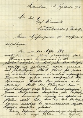 Zweiseitiger Brief, deutsche Übersetzung nach jeder Zeile. Auf der Vorderseite: "Im Voraus besten Dank.", Stempel: "Postprüfungsstelle Kriegsgefangenenlager Landau, Pfalz". Auf der Rückseite ein handschriftlicher Text. Transkription: "Landau 28. September 1916 / An das (...)ach. Kommando Niederkirchen bei Deidesheim / Dem Gefangenen ist auch folgendes (...)zulegen: Den in der Kiste No. enthaltene aus Rinde hergestellte Behälter enthaltend Fett hatte Herr (...)und (...)offizier (...) gerne für seine Landung gegen eine entsprechende Vergütung. Falls der Gefangene dem Herrn (Hangtmann) denselben zur Verfügung stellen will, bitten wir in dem beiliegenden Kistchen denselben zurück. Wenn nicht bitten um Bescheid.".