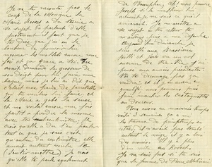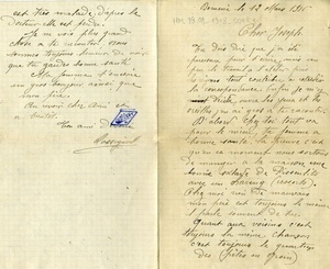 Vierseitiger Brief: Umschlag: Adressat: "Monsieur Mouret / Joseph Prisonnier de / guerre. Au Camp Ebenberg- / Landau. Pfalz. Palatinat / 3e Compagnie 9e Barraque / Baviere (allemagne)", 2 Stempel: "Domene / Isere / 13 - 3 / 16", "A. A. / Geprüft"; Brief: handschriftlicher Text Transkription: "Domene le 12 Mars 1916 / Cher Joseph / Tu dois dire que j’ai été paresseux pour d’ecrire, mais un peu le travail à l’atelier puis les vignes tout contribu à retarder la correspondance. Enfin je m’y décide: ouvre les yeux et les oreilles j’en ai gros à te raconter. D’abord chez toi tout va pour le mieux, ta femme a bonne santé. La preuve c’est qu’en ce moment nous sortons de manger à la maison une bonne salade de Pissenlits avec un (...). Chez moi rien de mauvais mon père est toujours le même il parle souvent de toi. Quant aux voisins c’est toujours la même chanson c’est toujours le quartier des pâtes en grain. Je ne te raconte pas le coup de la Monique la Marie Besset a du t’écrire a se sujet. En parlant d’elle justement il faut que je te dise que j’ai eu le bonheur de pouvoir lui mesurer les mollets encore une fois et ca grace à toi. Tu avait demandé la grosseur de son doigt pour lui faire une bague, mais je lui ai dit que c’était une paire de jarretelles qui tu voulais lui faire, et la Marie a gobé la sauce et me voilà encore une fois partit à prendre la mesure avec ton centimètre; je crois qu’elle a du t’en parler tout ce que je sais c’est qu’au(...) du centimètre elle aurait autant voulu la sentir mettre. Je crois qu’elle te parle egalement de (...); ah! mon pauvre Joseph si le malheur lui arrivait je ne sais ce qu’il arriverait. Je m’arrêtte à se sujet à ton retour te m’aideras puis à me defendre. Aujourd’hui dimanche je suis allé aux Brassienes taillé et j’ai vu un vol enorme de Fia-Fia. J’ai pensé aux anneés précedentes: Ne te decourage pas ca viendra et il y en aura en quantité; nous pourons puis faire marcher les castagnettes en douceur. Nous avons eu mauvais temps voilà trois semaines ca a mi les travaux du printemps en retard; il n’avait pas tombé autant de neige il y a bien des années. Il y a plus d’un mètre au Bosset. Je ne sais pas si tu sais que la femme de Pierre Malinari est très malade; d’après le docteur elle est perdu. Je ne vois plus grand chose à te raconter; nous sommes toujours heureux de voir que tu gardes bonne santé. Ma femme t’envoie un gros bonjour ainsi que mon père. Au revoir cher ami et à bientôt. Ton ami devoué (Rossignol)" Übersetzung: "Domene, den 12. März 1916 / Lieber Joseph / Du musst sagen, dass ich zu faul war, um dir zu schreiben, aber ein bisschen Arbeit im Atelier und dann die Reben, das alles trägt dazu bei, den Briefwechsel zu verzögern. Schließlich habe ich mich dazu entschlossen: Öffne die Augen und die Ohren, ich habe dir viel zu erzählen. Zu Beginn, bei dir läuft alles bestens, deine Frau ist bei guter Gesundheit. Der Beweis hierfür ist, dass wir gerade in diesem Moment zu Hause einen guten Löwenzahnsalat mit einem (...) gegessen haben. Bei mir gibt es nichts schlechtes, meinem Vater geht es wie immer, er redet oft von dir. Mit den Nachbarn ist es immer dasselbe Lied, es ist immernoch das Viertel der (Körnerkuchen). Ich erzähle dir nicht die Sache von Monique, Marie Besset musste dir darüber berichten. Während ich gerade von ihr rede, muss ich dir sagen, dass ich das Glück hatte, ihr nocheinmal die Waden messen zu können, und das dank dir. Du hattest sie nach der Größe ihres Fingers gefragt, um ihr einen Ring zu machen, aber ich hatte ihr gesagt, es handelt sich um ein Paar Strumpfhalter, die du ihr machen willst, und die Marie hat die Soße geschluckt und mich noch einmal (gebeten) mit deinem Meter das Maß zu nehmen; ich glaube, sie musste dir davon berichten, (soweit ich weiß ist es wegen dem Meter), (...). Ich glaube, sie wird dir auch von (...) erzählen. ah! mein armer Joseph, wenn sie das Unglück ereilt, weiß ich nicht, was passieren wird. Ich höre bei diesem Thema auf, bei deiner Rückkehr wirst du mir helfen und mich dann verteidigen. Heute, Sonntag, bin ich zu den großen Brassienes gegangen und habe einen großen Flug von (Fia-Fia) gesehen. Ich habe an die vergangenen Jahre gedacht: Entmutige dich nicht, es wird schon kommen und es wird zu Hauf kommen; wir können dann sanft die Kastagnetten laufen lassen. Wir hatten schlechtes Wetter für drei Wochen, das hat die Arbeit vom Frühling verzögert; es hat seit einigen Jahren nicht mehr so viel Schnee gegeben. Es gibt mehr als einen Meter. Ich weiß nicht, ob du weißt, dass die Frau von Pierre Malinari sehr krank ist; dem Arzt zufolge ist sie verloren. Mehr sehe ich nicht, dir zu erzählen; wir sind immer glücklich zu sehen, dass du gesund bleibst. Meine Frau sendet dir einen lieben Gruß sowie auch mein Vater. Auf Wiedersehen lieber Freund und bis bald. Dein treuer Freund (Rossignol)".