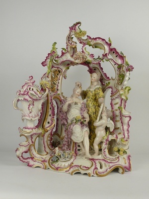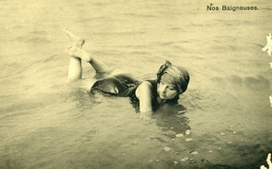 Vorderseite: Fotografie, die eine junge Frau in flachem Meerwasser zeigt. Sie trägt ein Tuch um den Kopf und einen Badeanzug. Sie liegt auf dem Bauch, die Füße in der Luft, der Blick abgewendet. In der rechten oberen Ecke steht geschrieben: "Nos Baigneuses" [übersetzt: Unsere Badenden]. Auf der Rückseite: [handschriftlich:] "Feld", [gedruckt:] "Carte Postale", Stempel: "Gent / (Belgien) / 6. 2. 15. 11-12 V", Adressat: "Herr / Bademeister Geise / Neustadt an der Haardt / Rheinpfalz" sowie ein handschriftlicher Text. Transkription: "Es geht gottlob immer noch gut. So schwimmen sie im Uebersch(...)gebiet. Hoffentlich sehen wir uns bald. (...)".