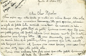 Karte im Querformat. Auf der Vorderseite: "Correspondance militaire", Abbildung: 3 Fahnen, die mit Zweigen umwunden sind und auf denen steht "Honneur et Patrie" [Ehre und Vaterland], Künstlersignierung: "J. Beuzon", Absender: "Monsieur Millière / Facteur à Sombernon (côte d’or)", Adressat: "Monsieur Jeandet Nicolas / Réserviste, 10e / D’Infanterie / 5e Compagnie / 2e Bataillon Secteur Postal No 53 (faire suivre)", Stempel: "Somernon / Côte d’or / 19 20 / 11 - 3 / 15". Auf der Rückseite ein handschriftlicher Text: Transkription: "Bonne (bibise papa) chèri Lucienne Jeudi 11 Mars 1915 Mon cher Nicolas Nous avons recu votre carte ce matin, en même temps votre colis dont nous vous remercions beaucoup. Elle sont acquises. Marie se régale et petite Lulu aussi et nous tous. La maman va bien - ainsi que votre petit Dédé et petite Lucienne aussi, qui dit que son petit papa est gentil. Marie vous écrirera sur la fin de cette semaine une longue lettre. Ne vous tourmentez pas sa santé va aussi bien que possible. Nous pensons que votre santé est toujours bonne et lorsque vous nous écrirez vous nous disez si vous avez recu votre petit colis. Marie vous embrasse bien fort ainsi que votre petite Lucienne et toute la famille. L. Milliere". Übersetzung: "[oben links schräg:] Gute (Küsschen) lieber Papa Lucienne Donnerstag, 11. März 1915 Mein lieber Nicolas Wir haben Ihre Karte heute morgen erhalten, zur gleichen Zeit wie Ihr Paket, für das wir Ihnen sehr danken. Sie sind unter Dach und Fach. Marie schlemmt und die kleine Lulu ebenso und wir auch. Der Mama geht es gut - ebenso wie Ihrem kleinen Dédé und auch der kleinen Lucienne, die sagt, dass ihr kleiner Papa nett ist. Marie wird Ihnen am Ende dieser Woche einen langen Brief schreiben. Machen Sie sich keine Sorgen, ihre Gesundheit ist so gut wie nur möglich. Wir denken, dass Ihre Gesundheit auch immernoch gut ist und wenn Sie uns schreiben, sagen Sie uns, dass sie unser kleines Paket erhalten haben. Marie umarmt Sie sehr fest ebenso wie Ihre kleine Lucienne und die ganze Familie. L. Millière".